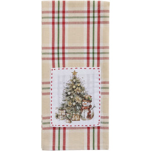 Add nostalgic holiday charm to your space with this decorative towel, perfect for the kitchen or guest bath. The background features a warm tan plaid with classic red, green, and white stripes, giving it a cozy, traditional look. A printed patch on the front showcases a beautifully decorated Christmas tree surrounded by wrapped gifts and an adorable snowman in a top hat and scarf. The red stitched border adds a handmade feel. Both festive and functional, this towel is ideal for drying hands or displaying as a cheerful seasonal accent throughout your home.
