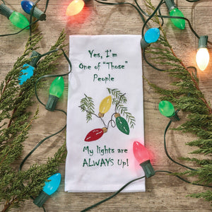 This decorative towel adds humor and festive charm with its playful embroidered design. Set on a crisp white background, it features colorful Christmas lights in red, yellow, and green, hanging from pine sprigs. The towel is accented with the fun holiday phrase, "Yes, I'm one of "Those" People. My lights are ALWAYS up!" stitched in green lettering. Bright, cheerful, and whimsical, it's the perfect way to show your holiday spirit all season long. Both decorative and functional, this towel makes a great seasonal accent-ideal for adding personality in the kitchen or bringing a lighthearted touch to the guest bath.