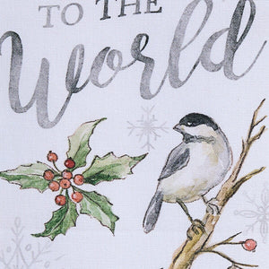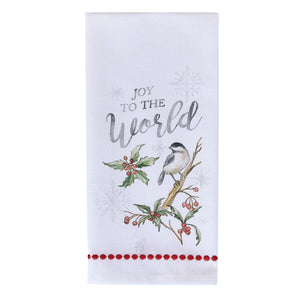 Celebrate the season with this elegant decorative towel featuring a soft watercolor-style chickadee perched on a holly branch with red berries. Light gray snowflakes add a wintry background, and the phrase "Joy to the World" is printed in graceful script above the artwork. A red pom-pom trim along the bottom adds a cheerful finishing touch. The crisp white fabric makes the design pop while offering a clean, classic look that complements a variety of holiday styles. Perfect for use in the kitchen or guest bath as a functional towel or festive accent.