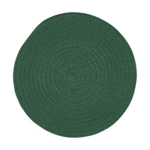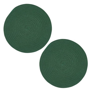 Add a rich pop of color to your table with this set of 2 round placemats in a deep forest green. Designed with a braided texture, these placemats bring both style and durability to everyday dining or festive gatherings. Each piece measures generously to accommodate dinnerware while protecting your table from scratches and spills. Their timeless design makes them easy to mix into seasonal or year-round settings. Pair with coordinating pieces from our tabletop line to create a pulled-together look that's perfect for casual meals, holiday entertaining, or layering under centerpieces for added charm. Listing is for a set of 2 placemats only.