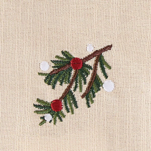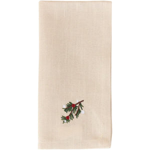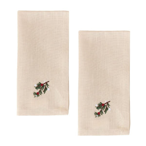 This set of 2 napkins brings simple elegance to your holiday table with a subtle festive touch. Made in a soft beige fabric, each napkin features a small embroidered sprig of greenery accented with red berries and white details, creating a refined seasonal design. The understated style makes them versatile enough to complement a variety of table settings, from rustic to classic. Crafted with care for both durability and beauty, these napkins add a touch of charm to family meals, holiday gatherings, or everyday dining. Perfect for use in the kitchen or dining room. Listing is for a set of 2 napkins only.