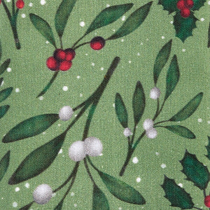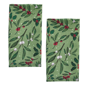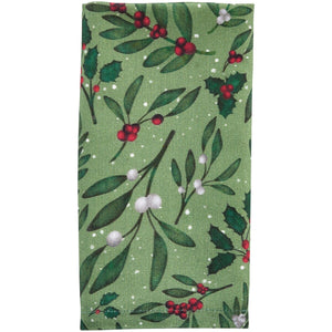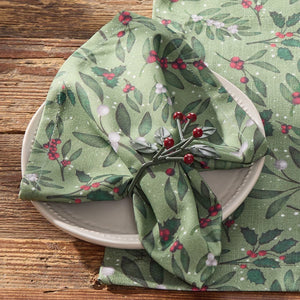 This set of 2 napkins features a festive mistletoe and holly design, perfect for holiday entertaining. The rich green background is accented with sprigs of mistletoe, holly leaves, and clusters of bright red and white berries, creating a cheerful seasonal look. Subtle white speckles mimic falling snow, adding to the wintry charm. Crafted from durable fabric, these napkins combine style and practicality, making them ideal for holiday dinners, parties, and everyday seasonal use. Use them to dress up your dining table, layer with coordinating linens, or bring a touch of holiday spirit to your kitchen or dining room. Listing is for a set of 2 napkins only.