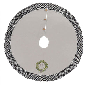 Add a cozy farmhouse touch to your tree with this soft gray tree skirt, featuring a printed wreath of green foliage, a black-and-white checkered bow, and the heartfelt message "Winter Blessings" in elegant cursive. The ruffled gingham trim adds extra charm, while wooden button closures make it easy to wrap around your tree base and keep everything snug. It's the perfect way to hide the stand and frame your presents with rustic style. Pair it with coordinating decor from our collection to create a look that's warm, welcoming, and full of seasonal spirit.