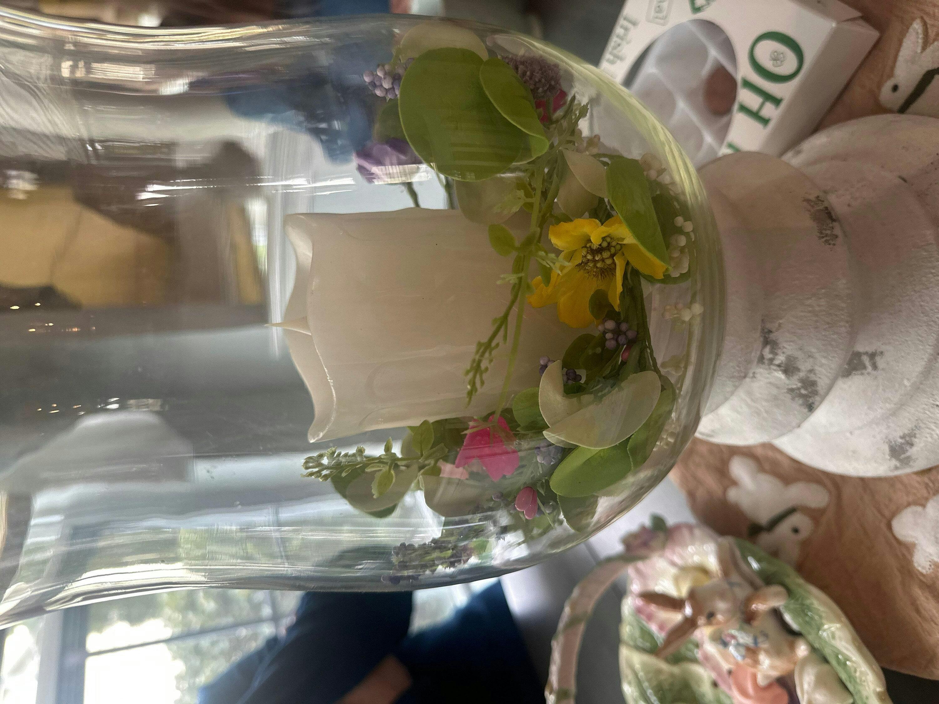 The Spring Mix Blossoms Ring is a decorative springtime floral candle ring with a green-wrapped base. The ring contains branches of textured greenery, alongside miniature floral buds and colorful pastel blooms. Pair this ring with an LED pillar or scented candle and place atop a riser, shelf, or table space for a cheerful addition to the home during Spring. Measures 3.5” in diameter (inner) and approximately 8-10" in diameter (outer).