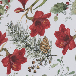 Add a vibrant botanical flourish to your holiday table with this festive runner, bursting with red amaryllis blooms, holly sprigs, pinecones, and lush greenery like eucalyptus, mistletoe, and fir. The crisp white background lets each watercolor-style illustration shine, creating a fresh, garden-inspired take on traditional Christmas decor. Perfect for winter gatherings, holiday brunches, or adding a natural touch to your seasonal setup. Pair it with coordinating table linens in our collection to create a look that's elegant, lively, and full of holiday spirit.