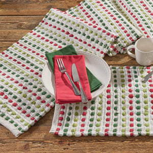 Add a pop of playful pattern to your holiday table with this woven runner featuring rows of red, green, and dark green rectangles on a crisp white background. The design is festive without being fussy-perfect for Christmas dinners, cookie swaps, or cozy cocoa breaks. The thick, textured weave adds a handcrafted feel that pairs beautifully with rustic wood, seasonal ceramics, or twinkling lights. Mix and match with other coordinating table linens in our collection to create a look that's merry, modern, and full of personality.