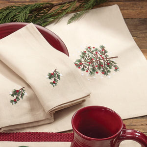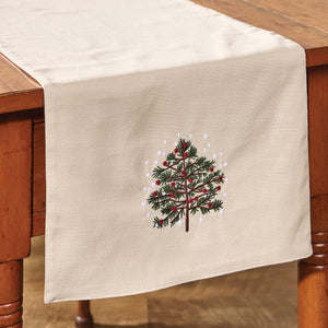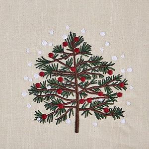 Add a touch of handcrafted holiday charm to your table with this beige runner, featuring a printed Christmas tree design made of green pine branches and bright red berries. White snowflake dots dance around the tree, adding a wintry sparkle that's perfect for seasonal dinners, festive brunches, or cozy evenings by candlelight. The natural tones and textured background make it easy to pair with rustic wood, classic ceramics, or layered greenery. Combine with other coordinating table linens in our collection to create a look that's warm, welcoming, and full of Christmas spirit.