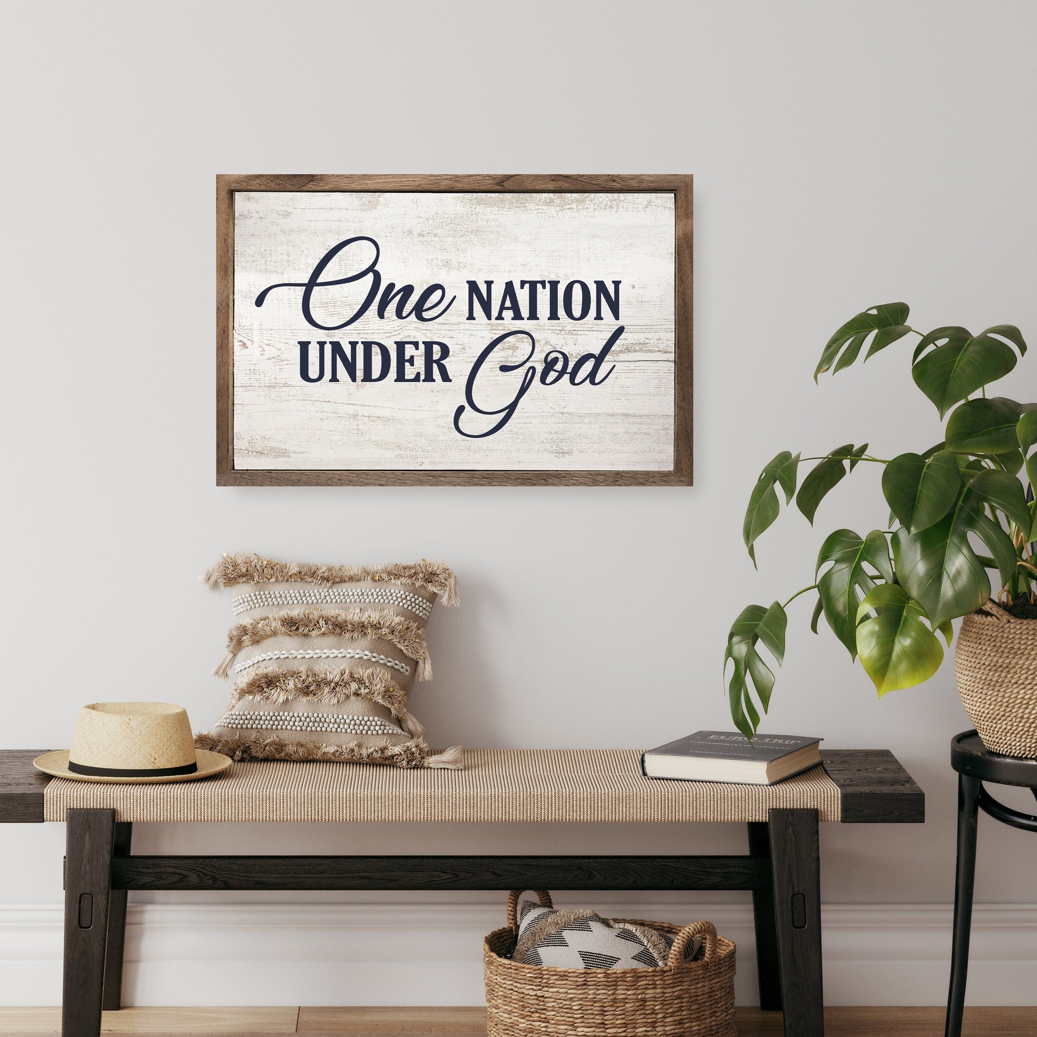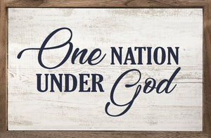One Nation Under God whitewash wall sign featuring bold, clear text. Simple design highlights the message with a rustic, weathered look. Ideal for patriotic decor, it adds a meaningful touch to any room.
