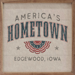 Personalized America's Hometown wall sign featuring a detailed printed design. Customizable with your chosen town name. Ideal for adding a personal touch to any space. Durable print captures the essence of hometown pride in a simple, stylish way. Perfect for home or office decor.