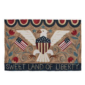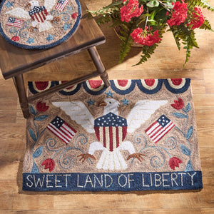 Celebrate classic Americana style with the Sweet Land of Liberty hooked rug. Featuring warm tan, rich navy, and deep red tones with a bold eagle, flags, and floral accents, it adds texture and charm to any space. Perfect for summer and patriotic holidays, it's ideal for entryways, kitchens, or living areas, bringing a welcoming, timeless look to both everyday decor and seasonal displays. Hand loomed and made from 100% cotton that is hand dyed so natural color variations will occur. Use a non-skid pad under rug to improve skid resistance and protect floors.