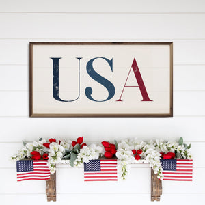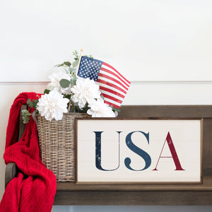 USA white printed wall sign. Clear design featuring the American flag and bold text. Ideal for patriotic decor or office spaces. Durable print ensures lasting color and detail. Simple, striking addition to any wall.
