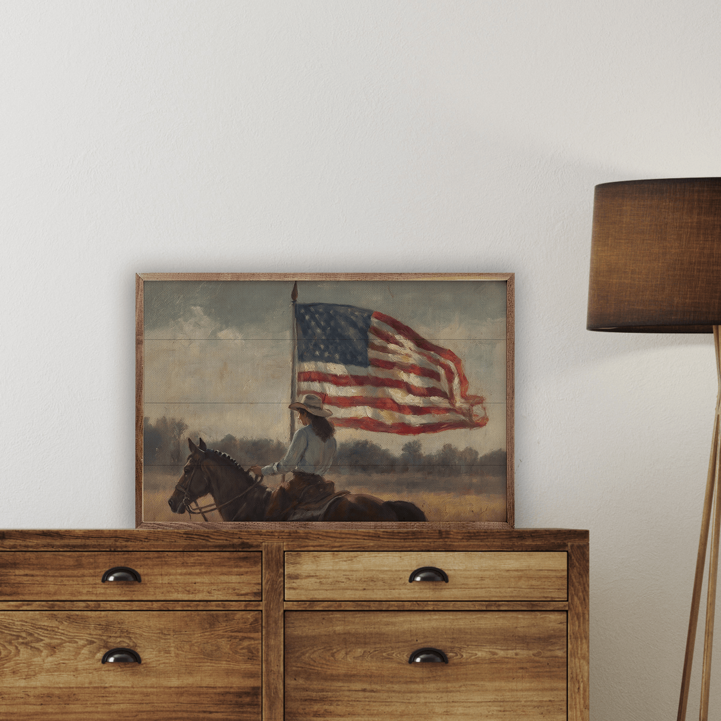 Vintage Woman Rider With Flag Printed and Framed Wall Sign