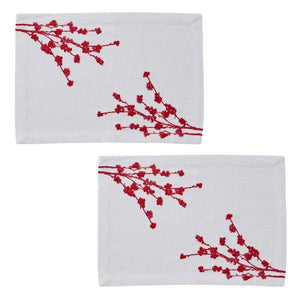 Simple, elegant, and just a little bit spicy-this set of two rectangular placemats features a crisp white background adorned with red floral branches in opposite corners. The design combines printed stems with delicately embroidered berries, creating a layered effect that's both visually striking and subtly textured. The blossoms pop with vibrant detail, adding a touch of warmth and charm without overwhelming your table. Perfect for holiday dinners, romantic brunches, or any meal that deserves a little flourish. Pair with coordinating pieces from our tabletop line to create a setting that's refined, festive, and quietly stunning. Listing is for a set of 2 placemats only.