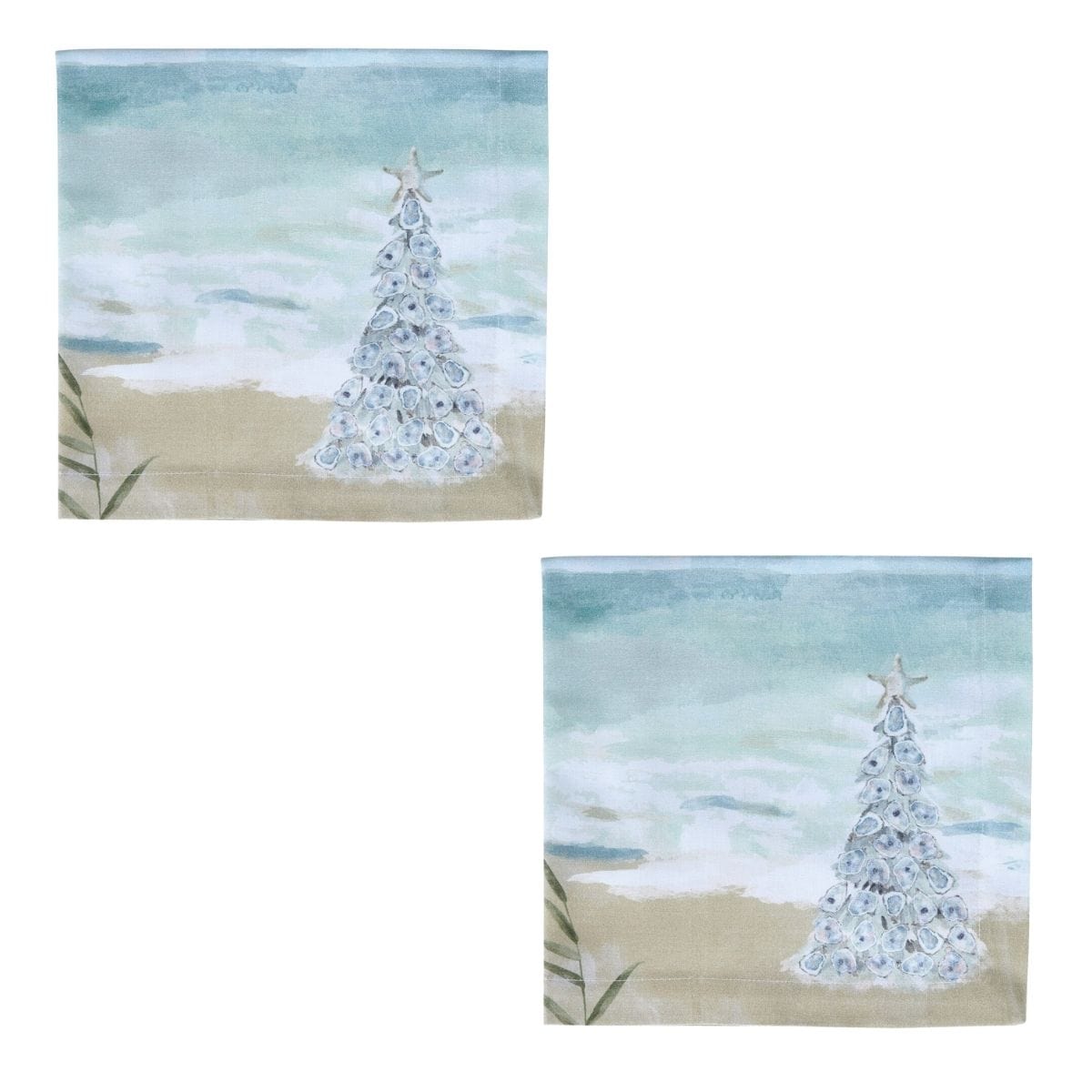 Set a coastal holiday table with this Oyster Tree Napkin Set of 2. Each napkin features a serene seaside scene in soft shades of aqua, sand, and white, showcasing a unique Christmas tree crafted from oyster shells and topped with a starfish. The watercolor-style design gives it a fresh, breezy look perfect for beach lovers and coastal-inspired homes. Use these napkins to add a touch of seaside cheer to your holiday meals, whether for casual gatherings or festive dinner parties. Listing is for a set of 2 napkins only.