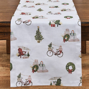 Add a splash of coastal whimsy to your holiday table with this cheerful runner, scattered with festive illustrations on a crisp white background. From red Adirondack chairs and beach umbrellas to bicycles loaded with gifts and tiny trees, each motif blends classic Christmas charm with breezy seaside flair. Wreaths, decorated trees, and stacks of presents round out the playful pattern, making it perfect for warm-weather celebrations or anyone dreaming of a holiday by the shore. Pair it with other coordinating table linens in our collection to create a look that's lighthearted, colorful, and full of seasonal joy.