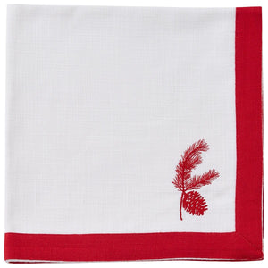 This set of 2 napkins features a classic holiday look with crisp white fabric framed by a bold red border. Each napkin is accented with an embroidered red pine sprig and pinecone in the corner, adding a seasonal touch of charm and texture. Perfect for Christmas gatherings or winter entertaining, these napkins combine elegance with festive style. Use them to dress up your holiday dining table, pair with coordinating linens, or give as a thoughtful hostess gift. Listing is for a set of 2 napkins only.