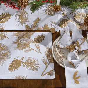 Bring the forest to your table-minus the squirrels. This set of two white placemats features a scattered print of pine needles and shimmering gold pinecones that add just the right amount of woodland glam. The fine linework gives it a hand-drawn feel, while the golden accents bring a festive sparkle to cozy dinners, cabin brunches, or Tuesday night takeout that deserves a little flair. Pair with coordinating napkins and runners from our tabletop line to create a look that's woodsy, warm, and wonderfully put-together. Listing is for a set of 2 placemats only.