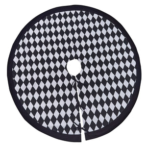 Wrap your tree in bold holiday style with this black-and-white harlequin-patterned tree skirt, featuring a dramatic diamond design and a sleek black border. With a center slit and tie closures, it's easy to secure around your tree base-hiding unsightly stands and setting the stage for festive flair. Whether you're going glam, farmhouse, or full-on merry, this skirt adds a punch of pattern that makes your ornaments and gifts pop. Use it to anchor your holiday setup and pair it with coordinating decor from our collection for a look that's crisp, classic, and totally Christmas-ready.