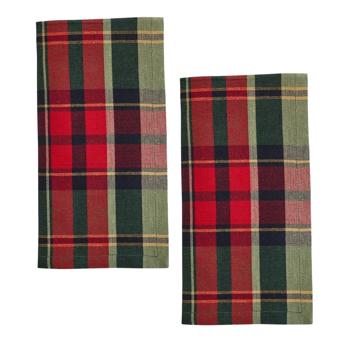 This set of 2 napkins features a timeless holiday plaid in bold red, green, and black with subtle gold and cream accents woven throughout. The traditional pattern brings a festive and classic touch to your table, perfect for Christmas gatherings or seasonal entertaining. Made with durable fabric and neatly hemmed edges, these napkins add both function and style to your tablescape. Use them to dress up place settings, line bread baskets, or accent your holiday buffet for a warm, inviting look. Listing is for a set of 2 napkins only.