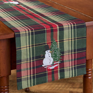 Add a playful pop of holiday cheer to your table with this embroidered runner, featuring a jolly snowman in a top hat and red scarf standing beside a festively decorated Christmas tree. Set against a cozy plaid backdrop in green, red, black, and gold, the scene brings a homespun charm that's perfect for Christmas dinners, cookie swaps, or seasonal gatherings. The stitched details and warm colors evoke a nostalgic, handcrafted feel. Pair it with other coordinating table linens in our collection to create a look that's whimsical, welcoming, and full of winter joy.