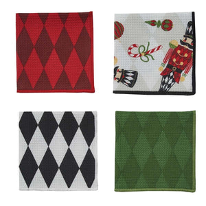 This festive dishcloth set includes four playful designs that bring holiday cheer to your kitchen. The set features a bold red diamond pattern, a black-and-white harlequin print, a solid green diamond texture, and a whimsical nutcracker design accented with candy canes and ornaments. Each dishcloth is made from waffle-weave fabric, providing excellent absorbency and durability for everyday use. The mix of patterns and colors-red, green, black, and white-creates a fun and coordinated seasonal look that's both practical and decorative. Perfect for the holidays, these dishcloths are great for drying dishes, wiping counters, or adding a festive touch to your kitchen decor.  Listing is for a set of 4 dishcloths only.