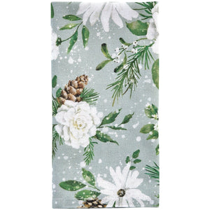 This set of 2 napkins captures winter elegance with a soft gray background decorated with white florals, pinecones, and greenery. Accents of pine sprigs and mistletoe give the design a natural, seasonal charm, while snowy speckling throughout adds a festive, frosted touch. The detailed print blends classic winter botanicals with a fresh, modern feel, making these napkins a stylish addition to your holiday table. Their versatile design pairs beautifully with a variety of table settings, from rustic to refined. Perfect for use in the kitchen or dining room, they bring both function and seasonal beauty to your gatherings.  Listing is for a set of 2 napkins only.