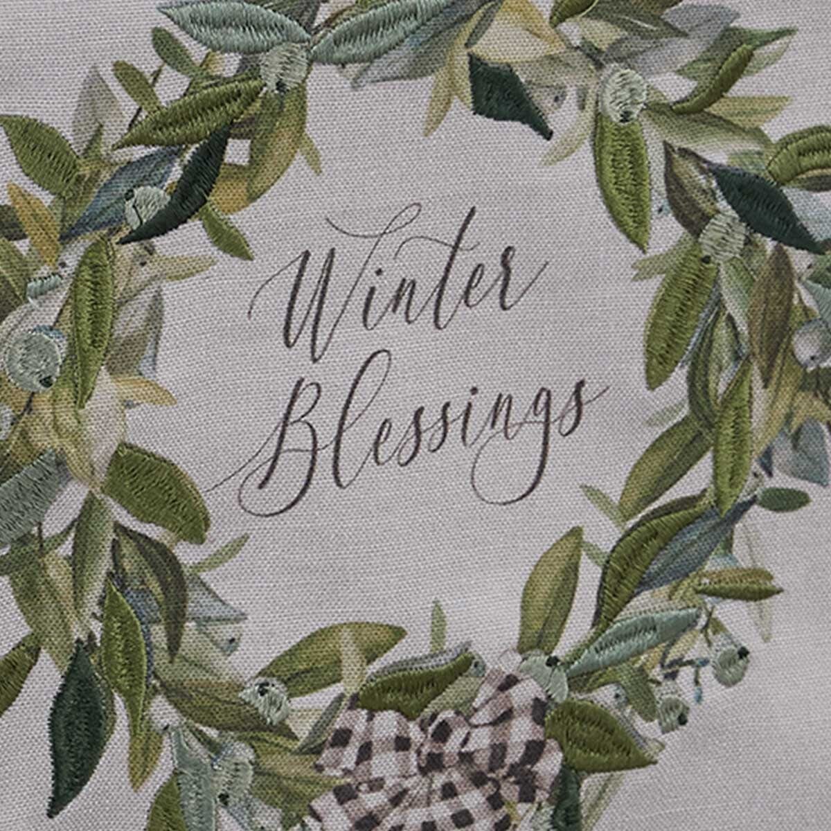 Celebrate the season with this cozy farmhouse-style runner, featuring a soft gray background and a printed wreath of green leaves and delicate white berries. In the center, the message "Winter Blessings" is printed in elegant cursive, tied together with a black-and-white checkered bow that matches the ruffled gingham trim. It's a heartfelt accent perfect for winter dinners, holiday gatherings, or simply adding a warm welcome to your space. Drape it across your table or sideboard, and pair it with other coordinating table linens in our collection to create a look that's rustic, inviting, and full of seasonal spirit.