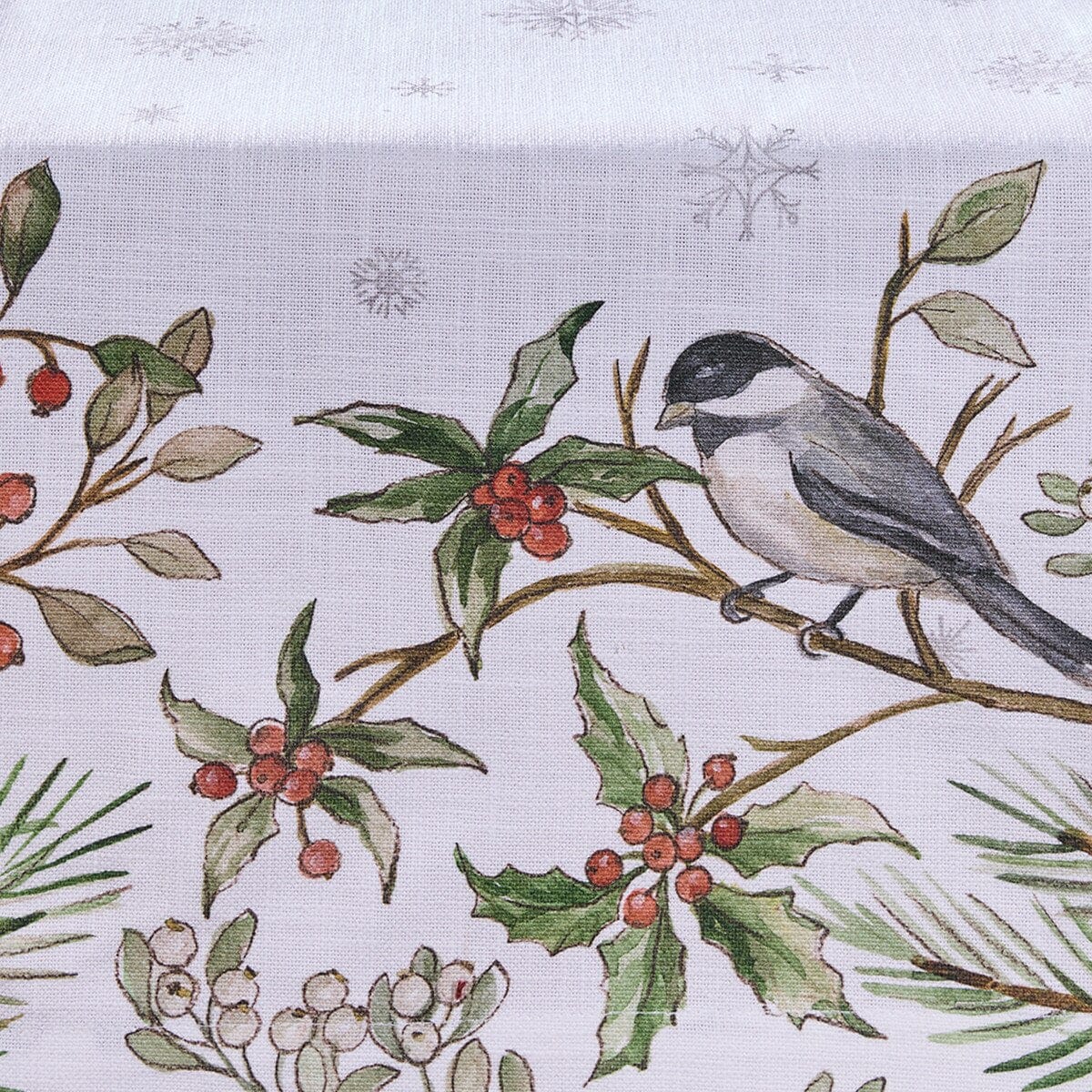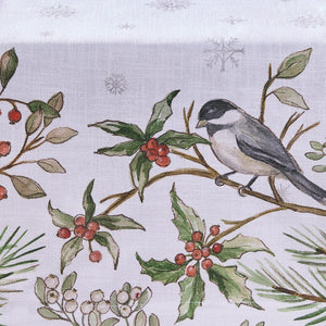 Add a touch of woodland wonder to your winter table with this nature-inspired runner, featuring a watercolor-style chickadee perched among holly leaves, red berries, and pine branches. Soft snowflakes drift across the white background, creating a peaceful, festive scene that's perfect for holiday dinners or seasonal gatherings. The delicate artwork and wintry palette bring warmth and charm to any setting. Pair it with other coordinating table linens in our collection to create a look that's cozy, elegant, and full of seasonal spirit.