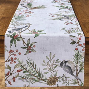 Add a touch of woodland elegance to your holiday table with this winter-themed runner, featuring watercolor-style chickadees perched among pine branches, holly leaves, and red berries. Soft snowflakes drift across the pale background, creating a peaceful seasonal scene that's perfect for Christmas dinners or festive gatherings. The delicate artwork and nature-inspired palette bring warmth and charm to any setting. Pair it with other coordinating table linens in our collection to create a look that's cozy, graceful, and full of winter magic.