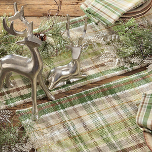 Add a cozy, woodland vibe to your table with this woven plaid runner in earthy tones of green, beige, brown, and white. The checkered and herringbone pattern gives it a rustic texture that's perfect for holiday gatherings, cabin dinners, or everyday farmhouse charm. Whether you're layering it with pinecones and candles or pairing it with seasonal ceramics, this runner brings warmth and character to any setting. Pair it with other coordinating table linens in our collection to create a look that's grounded, inviting, and full of natural style.