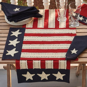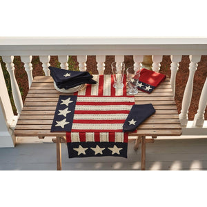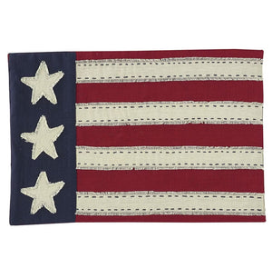 Add rustic patriotic charm to your table with this Americana-style placemat. Featuring bold red and cream stripes with decorative stitching and a navy blue panel with three appliquéd stars, it brings a homespun, vintage feel to any setting. The frayed edging adds texture and warmth, making it a perfect accent for summer entertaining, Memorial Day, or Fourth of July celebrations. Ideal for farmhouse, country, or primitive décor styles, this placemat adds festive flair to any dining table. Celebrate the season in classic Americana style with this eye-catching piece.