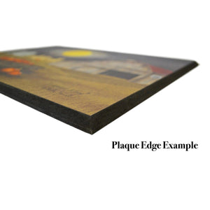 To make our art plaques, the paper art print is adhered to a manufactured wood board that is approximately 3/8" thick with an industrial adhesive made for the framing industry.  A protective texture coating is then applied that is also for the framing industry.  The edges of the board are beveled and color is applied to the edges.  It is finished with a sawtooth hanger and ready to hang on your wall.
