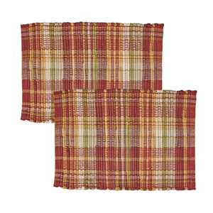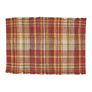 Add rustic charm to your table with this woven chindi plaid placemat, featuring a vibrant blend of red, gold, olive green, and cream tones. The thick, textured chindi weave creates a cozy, handcrafted look thatユs perfect for fall gatherings or everyday use in the kitchen or dining room. Whether you're hosting a seasonal dinner or simply want to warm up your tabletop decor, this placemat adds depth and character to your space. Mix and match with coordinating table linens to create a layered and inviting setting that reflects the beauty of autumn. Sold as a set of 2