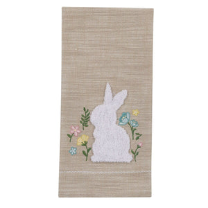 Bring a fresh dose of spring charm to your kitchen or guest bath with this embroidered bunny decorative dishtowel. Featuring a soft tan, linen-look background, the towel is accented with a fluffy white bunny surrounded by delicate embroidered florals in pastel pink, yellow, blue, and green. Finished with subtle stitched detailing along the bottom edge, it's perfect for Easter and spring decorating. Display it on an oven handle, towel bar, or hook in the kitchen, or use it in a guest bath as a charming hand towel for a cheerful, farmhouse-inspired touch.