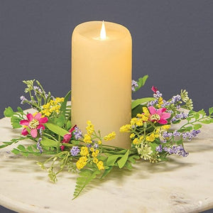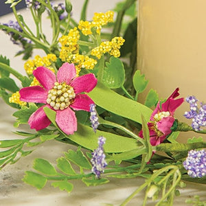 The Verbena Heather Blossoms Candle Ring brings a colorful accent to any spring or summer display. Perfect for placing around a candle or vase or used as a mini wreath, the candle ring has a flexible green wrapped stem base. Diverse leaves sprout from the ring, including ferns, fronds, and buds. Tiny yellow, purple, and white heather adds color throughout the ring, along with bold, bright pink blooms. Measures 3.5" in inner diameter and 11" in outer diameter approximately. Candles and accessories NOT included.